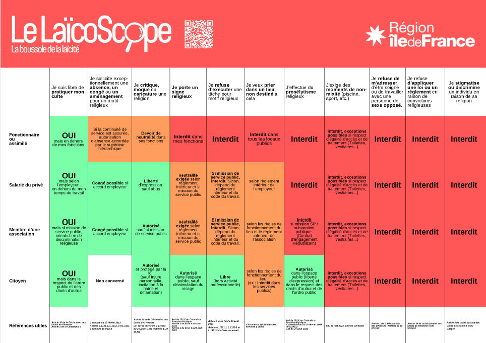 Cet outil pédagogique, lancé par la Région Île-de-France a été conçu pour clarifier et faciliter la compréhension du principe de laïcité dans la vie quotidienne des Franciliens. Ce support pratique s’adresse aux citoyens, agents publics, salariés et membres d’associations, en proposant des réponses concrètes à des situations fréquentes liées à la laïcité.